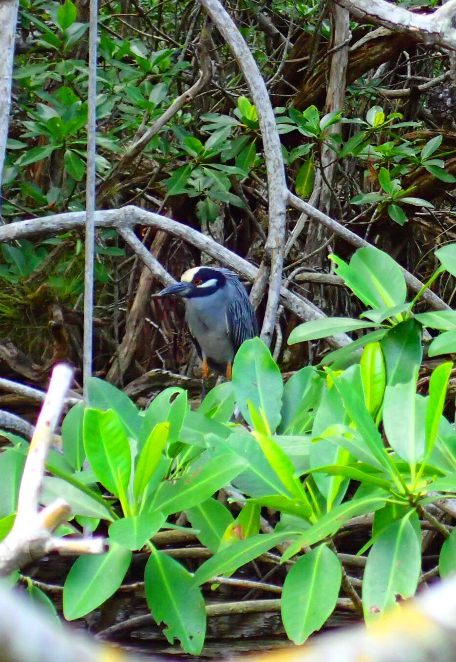 So I headed further downstream–a long excursion–to a shallow lake that often produced.  On the way, as I navigated through a tight mangrove tunnel, I was treated to a close-up view of a shy Yellow-imageCrowned Night Heron.  What an exotic beauty, the first I had seen in the wilds.  30 minutes later, I turned up a side channel that leads to the no-name lake, which on my GPS satellite view looks to me a lot like the Charlie Brown cartoon character Snoopy, so I have christened it Snoopy Lake.  And true to form, on the first cast it produced–a light strike.  My nerves rattled, I cast again and hooked something small.  As I brought it in, I saw it was a tiny six-inch needlefish, which snook like to eat.  But he wriggled off.  Now surely I was resigned to the ignominious skunk!