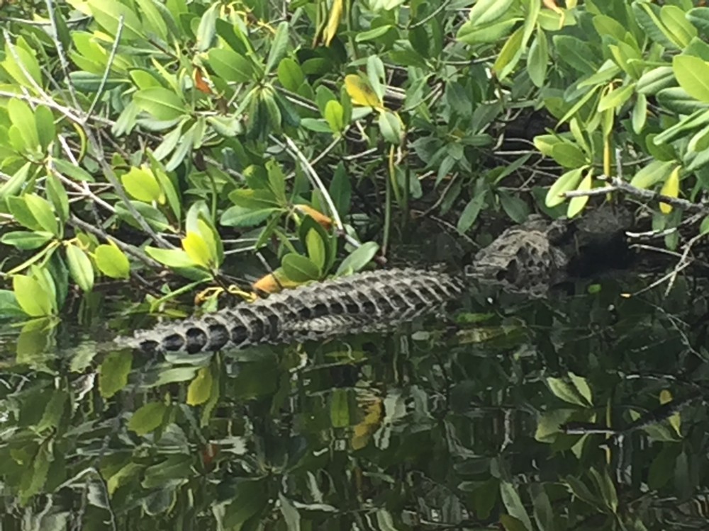 imageThen 15 minutes later, a spectacular sunrise greeted me as I crossed the first in a series of small lakes along the imagecreek.  Next a big dolphin hunting in the shallows surprised me, then a little gator way down further than I usually see them, a testament to the freshwater surge.  He was good enough to pose for a close-up before scurrying into the mangroves.  But by noontime when I had had only one half-hearted bite, my ardor was waning as the specter of a skunk loomed larger.  To make matters worse, I was seeing only a few forage fish in the crystal clear waters of the creek, and no snook at all.
