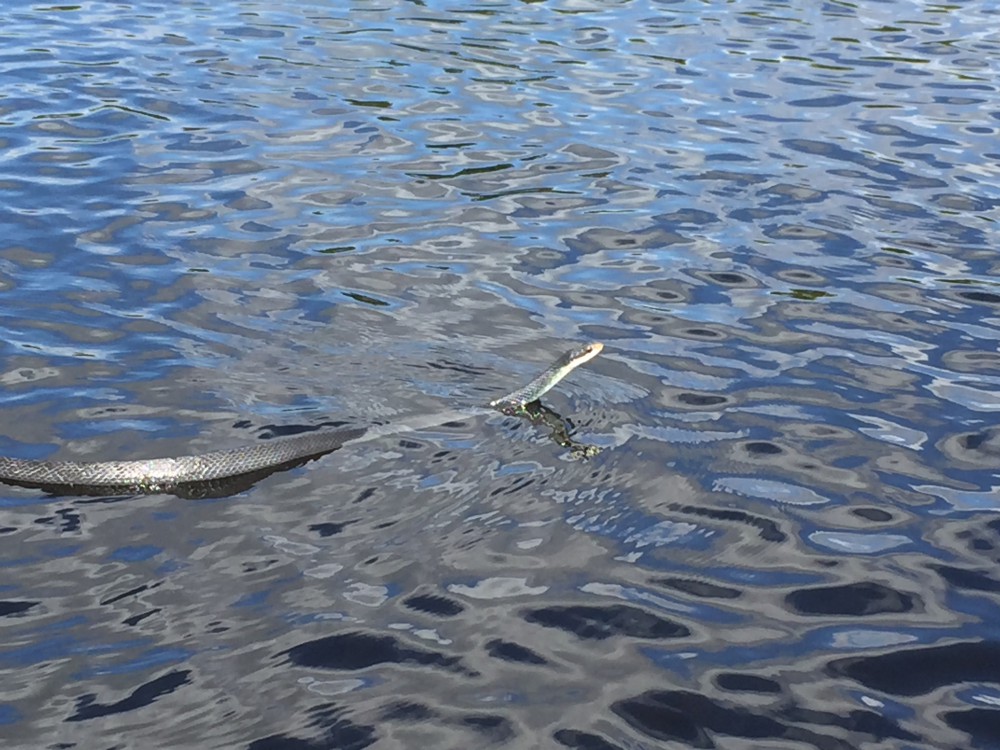 imageThat would be my only fish of the day, but the unspeakable “skunk” had been avoided to my great relief.  As I paddled back towards the put in, a big water snake came slithering out towards me, something oddly enough quite unusual to see in the backcountry.  It was beautiful to watch the sinuous swimming technique of this reptile, who didn’t take kindly to my attempts to get a good photo, giving me a withering glare that rivaled that of my high school English teacher Miss Pankratz when she caught you chewing gum in her class.