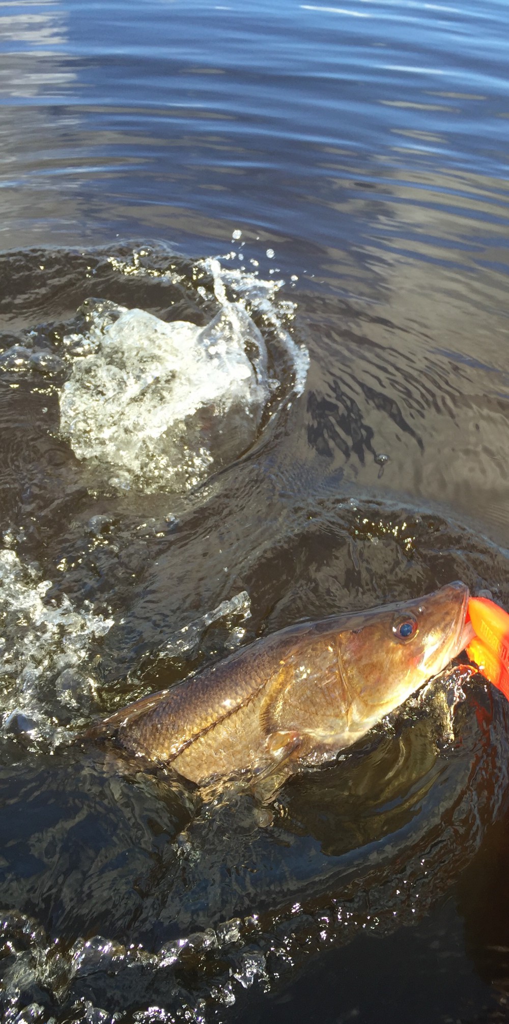 As I circled back around the lake to the inlet and journey home, I kept casting, enjoying the warm sun and praying silently for a hungry, albeit small needlefish with eyes bigger than his stomach to end my travails.  I saw a little school of them swirling 50 feet in front of the boat and plunked a cast right in their midst.  When the water erupted in a gusher, and a big snookimage came rocketing into the air, needless to say I was momentarily paralyzed.  She took off like a jet towards the other side of the lake as the drag on my reel, which was too tight, sizzled and screamed.  I let out a loud plaintiff “Noooooo,” fully expecting my line to snap.  Somehow it held, and she reversed course and ran back towards the mangroves.  I fumbled to throw my little anchor overboard to stop the fish from dragging me in with her, and pulled back hard on the rod, doubling it over,  Luckily, it turned the snook without snapping, and after another minute of frothing around the boat, she was mine–a 25-inch beauty.  A quick picture, and she shot back to her hiding place.