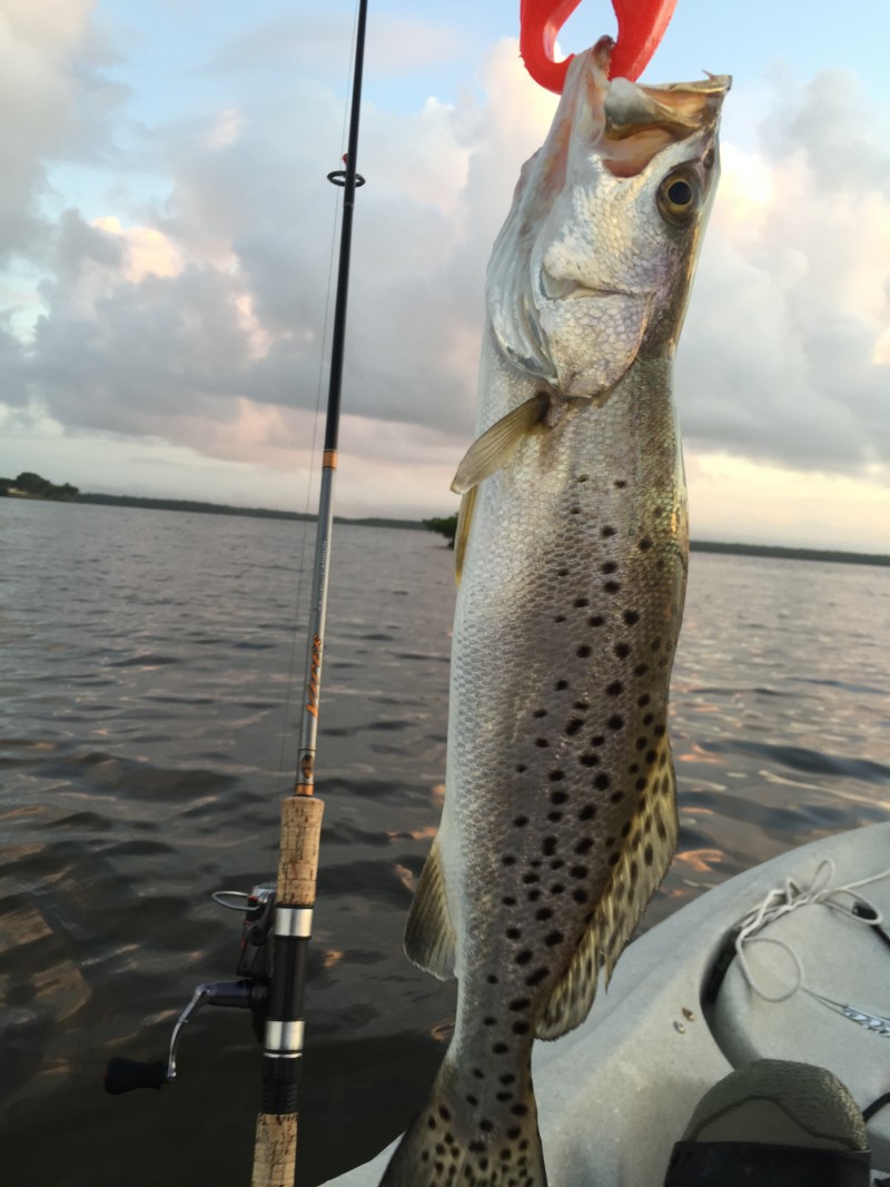 half hour I catch trout, ladyfish, snook, and mangrove snapper (which I rarely find in shallow water like this). One of the trout goes 20 inches, a good one in these waters, and the last circuit around the flat in my kayak produces a hefty 26-inch snook that tail-walks and zips off in long runs before coming to the boat and her freedom.