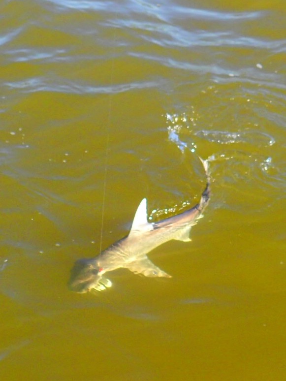 come to the surface. Maybe a redfish, because a snook would be jumping by now. Finally I winch the fish to the surface….and it turns out not to be a fish at all, but a bonnethead shark! Luckily the lure is in the corner of his mouth so his small, but plentiful and sharp teeth didn’t sever my line. I gingerly wriggle the hook free with my long-nosed pliers, and he jets off. To paraphrase Forrest Gump, fishing here is like a box of chocolates! Before moving on into the mangroves, I pull a dozen good-sized ladyfish and trout here from the same spot.