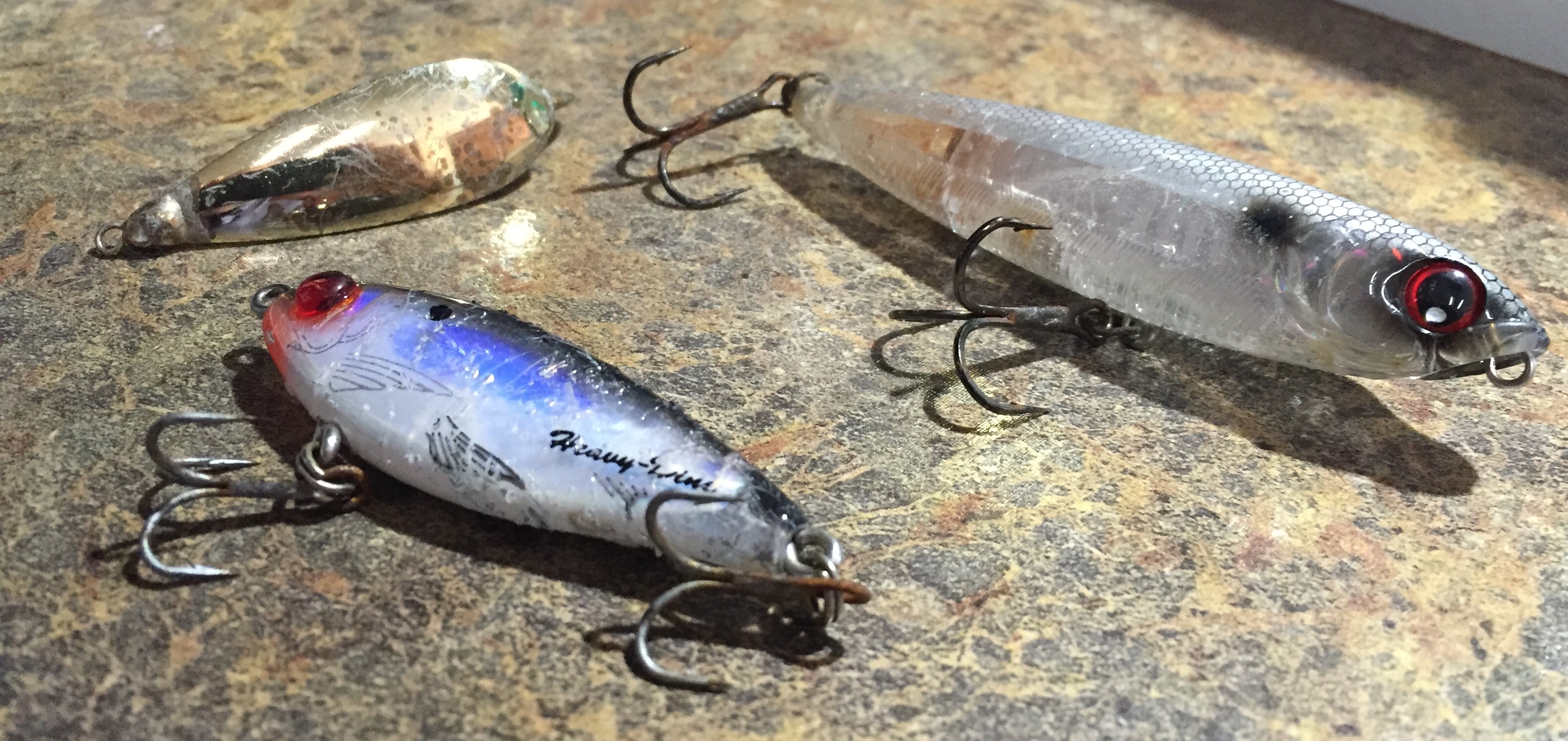 A Trio Of My Fav Cuda Lures--Gold Spoon, Yo-Zuri Pencil, and Mirrolure--With Battle Scars A Trio Of My Fav Cuda Lures–Gold Spoon, Yo-Zuri 3D Pencil, and Mirrolure–With Battle Scars