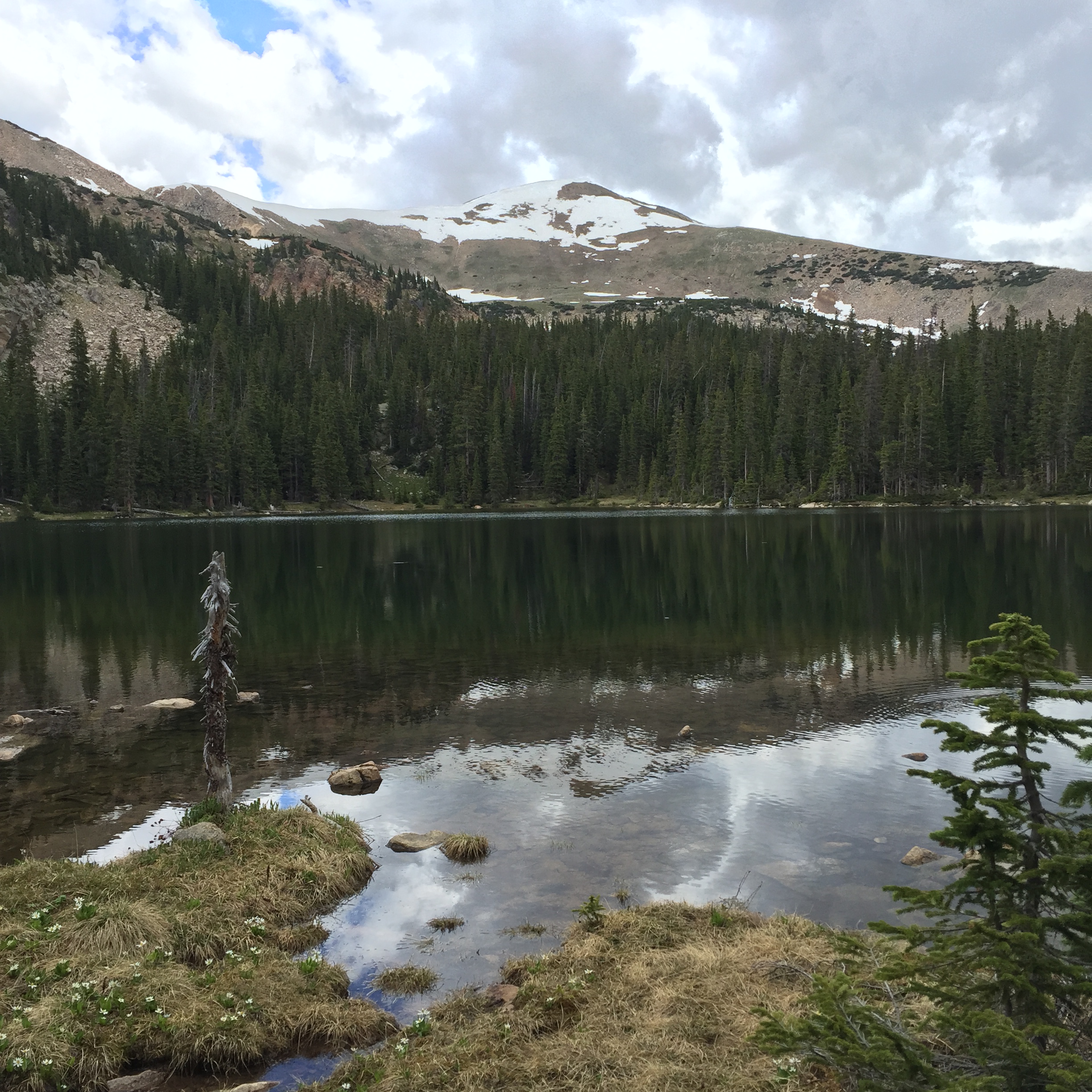 west of Salida. There is a good parking area on the east side of the highway, then it’s just a easy 100-yard walk back down the road to the trailhead on the west side. The hike is short–only about a mile–but the climb is immediate and steep going from 10,200 feet to 11,840. Keep the faith. If you can survive the first fifteen minutes, you are golden. Don’t forget your hiking pole! It usually takes me about 40 minutes to cover the mile, with ample breaks on the way up. A word of caution–the pestiferous mosquitoes will be on you whenever you stop so juice up with bug repellent before you start. Oddly, I rarely am bothered once I get to the water.