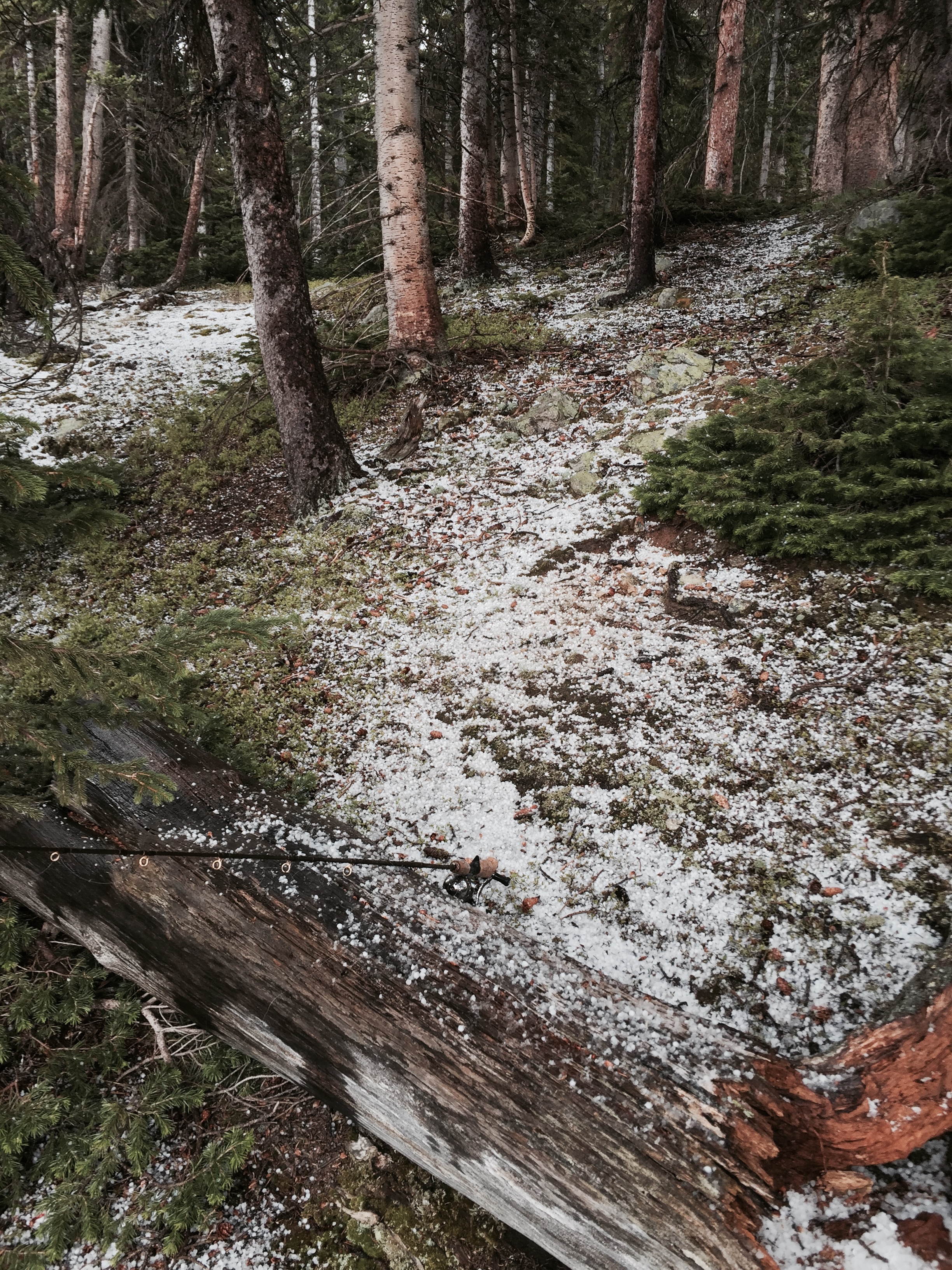 intervene. The partly sunny sky goes dark in a flash, and I am pelted with a nice mountain hail storm! The temperature plunges to near freezing as I huddle under a tree, wrapped in my fleece jacket and poncho for half an hour, thankful I remembered to pack my stocking cap and warm gloves. Half way through the storm a couple of guys come up the trail in shorts and no hats–they ask me if there is a shortcut back to Boss Lake!! No wonder people die in these mountains every summer. I have to break the bad news to them. Fortunately the sun soon breaks back out, and the rest of the day is warm with a blue-bird sky. I don’t find any bodies on the way back later, so happy to report the boys apparently made it safely. And more importantly, the fish are hungry!