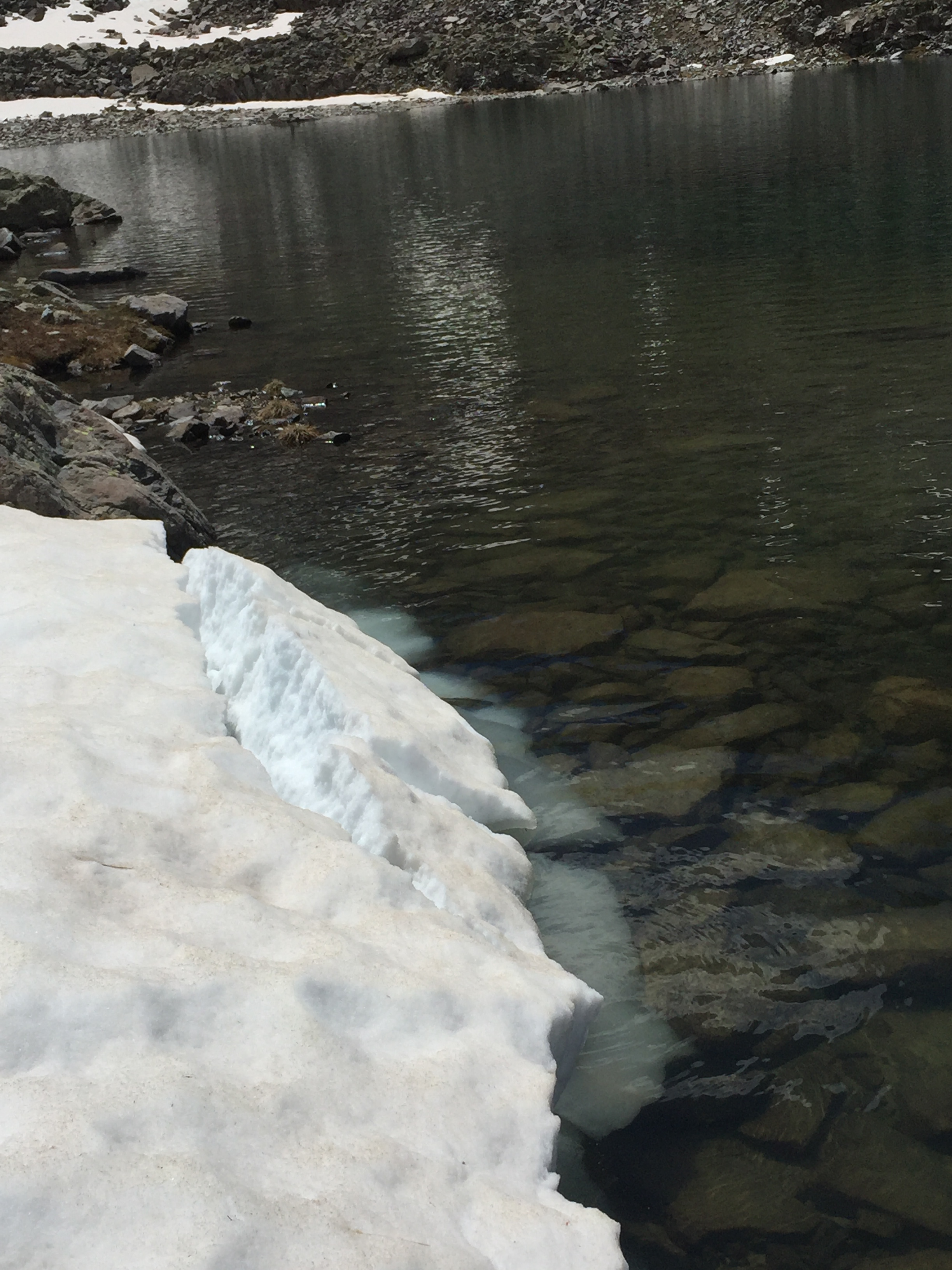 imageFinally the pesky mosquitoes and flies jolt me back into action.  I decide to make a clockwise circle aroundimage the lake, concentrating on a couple of mini-fjords on the south side that have produced some big fish in the past.  I get a few strikes, but see few cruising fish.  Finally I run into some icebergs calving off into the lake and some deep snow drifts that I carefully posthole through, hearing the water lapping up under them.  In the shallow water at the northwest corner of the lake, I spot some decent cutts cruising.  I get a couple of hits on the beetle, but no hookups, and then their interest quickly wanes, so I decide to go contrarian.  I tie on a #14 rubber-leg hopper pattern despite the fact that there aren’t any imagegrasshoppers within a country mile, and lay out a long cast along the deep north shoreline where some big trout are  congregating, probably getting ready to spawn.  I let the hopper settle and ripples disappear, then move it ever so slightly.  KERBLAMM!  A big cutt shoots up from the bottom and nails the fly, then rockets off into the depths.  He wanted that meaty meal!  I am lucky I have a stout #4 fly rod and 5X leader so I can turn the big guy.  The fight lasts a couple of minutes, and the cutt makes me wish I had a net as he continues to tussle in the shallows.  Finally he comes to the shore.  I remove the fly, take a quick picture of the 16-inch beauty, and let him return to his amorous adventures!