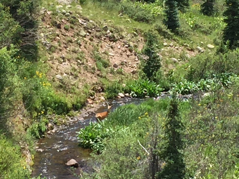 side. I see lots of deer and elk tracks and find a game trail that I follow. Suddenly I hear some clattering on the rocks below, and spot a mule deer walking nonchalantly down the river. The wind is in my face, so she doesn’t smell or hear me right away. What a beautiful sight! I watch her for a few minutes, then her ears perk up, and she spots me. The deer scrambles up the slope and disappears into the woods. I