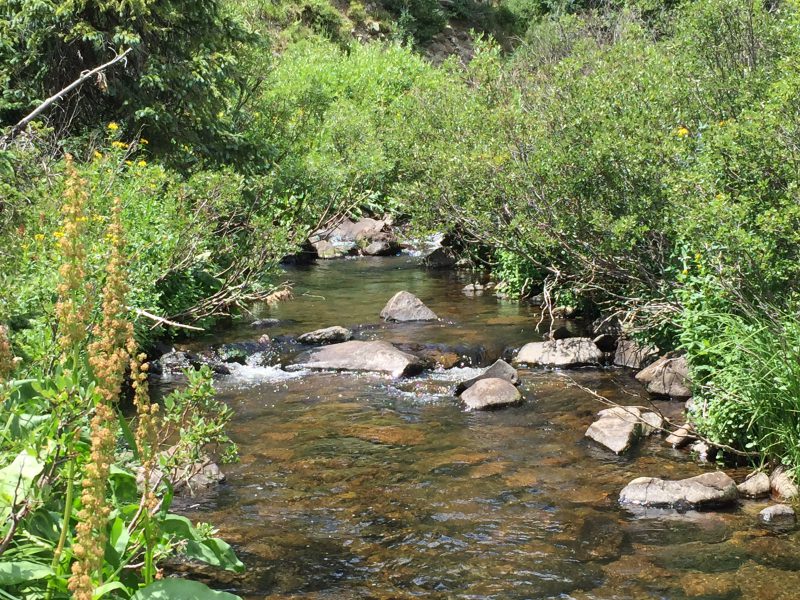 a very rough steep stretch, I arrive at the waterfall trailhead…and find a cadre of ATV’s and a jeep already there. When I have more daylight, I want to hike up above the waterfall, which acts as a barrier to non-native trout, allowing the beautiful native Rio Grande Cutthroat to thrive. But for now I’ll go contrarian and head back down the road for a 1/2 mile where I spotted a section of the river down in the canyon that looks inviting! And I should have it all to myself. I suit up in my waders and carefully pick my way down the steep but short slope that is overgrown with wildflowers and bushes–this is a lush valley that gets plenty of moisture. I see fish rising in the pools!!
