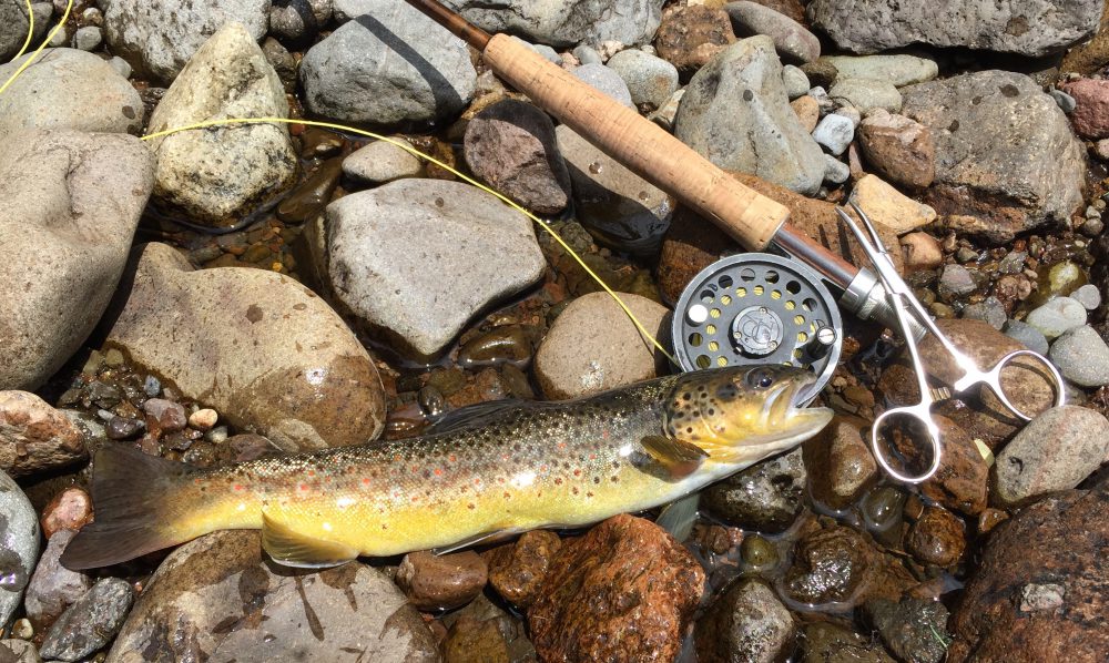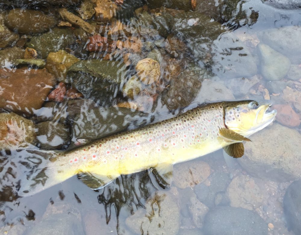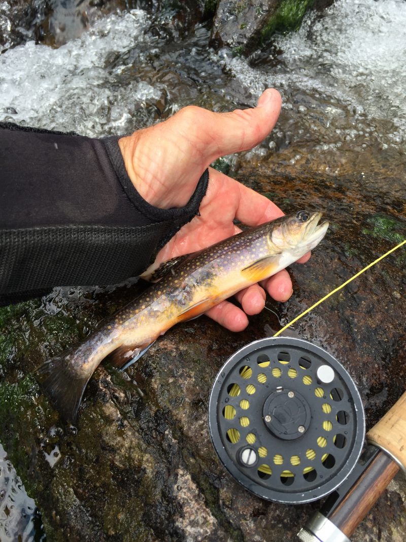 caddis and mayflies, so I tie on a #18 old reliable Royal Coachman Trude dry and a green caddis beadhead dropper. I’m not disappointed! A sleek 14-inch brown trout slashes out of the depths and nails the dry. Then for the next couple of hours I have steady action, with a mix of browns and brook trout. Most are small, but several foot-long browns bring a smile to my face. If I’m stealthy, the fish eagerly take the flies, but if they catch sight of me, they scatter like leaves on a windy fall day.