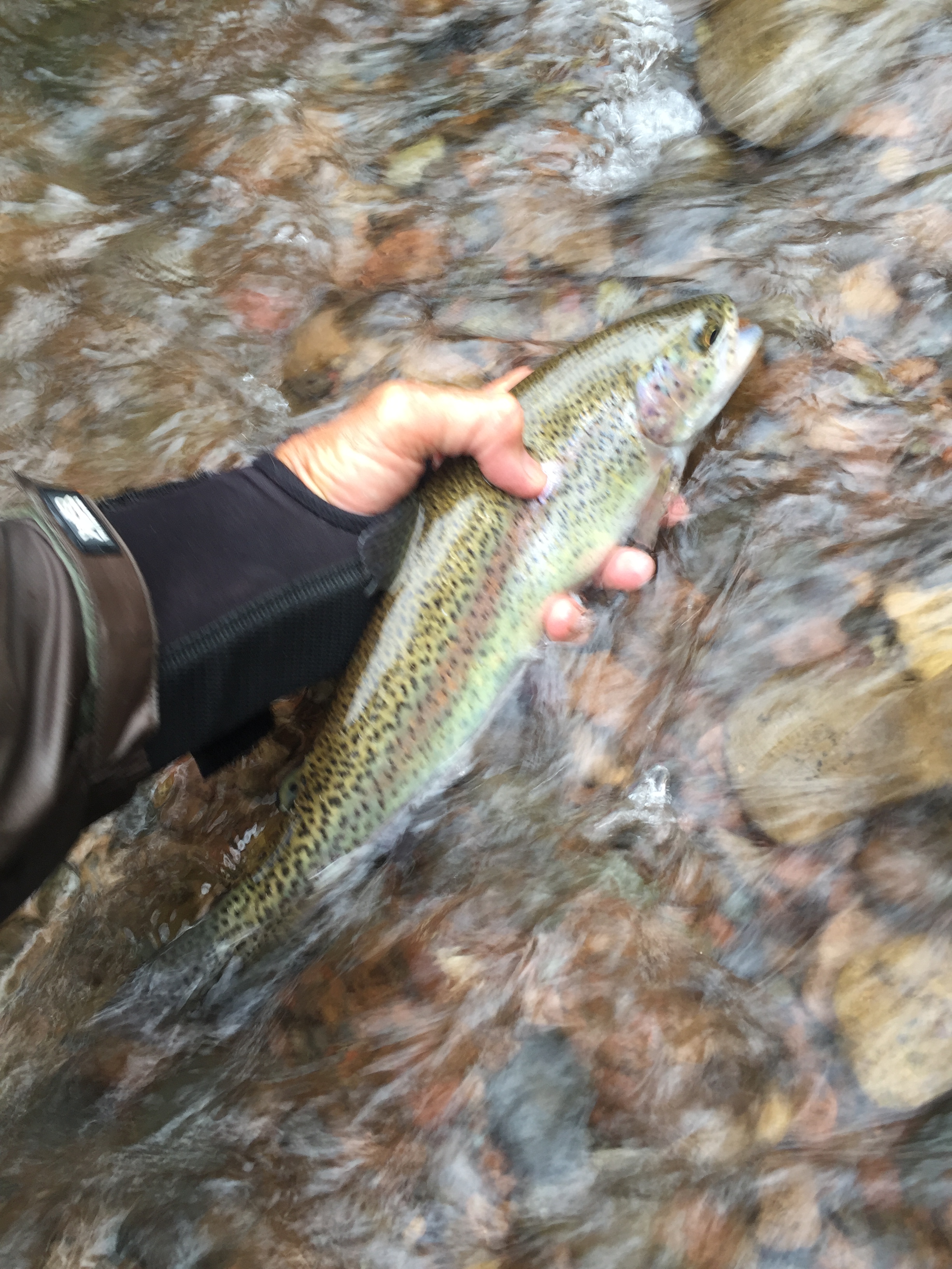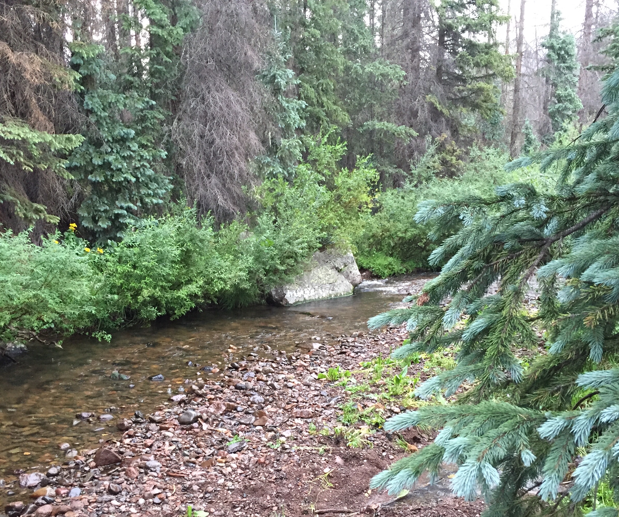 under the deadfalls and watch as the dry fly is pulled under. A heavy fish has grabbed the caddis nymph and dunked the dry. To my surprise, a big rainbow trout jumps clear of the water and runs upstream. I do my best Usain Bolt imitation as I give chase and finally bring him to the net–a very muscular 15-inch plus trout. I think to myself he must have migrated up from the reservoir where rainbows abound. As I slide the beauty back into the water, a bolt of lighting sizzles overhead followed by a huge clap of thunder. The rain follows as I scramble underneath stand of spruce tree that help keep me semi-dry during the deluge that lasts for 15 minutes.