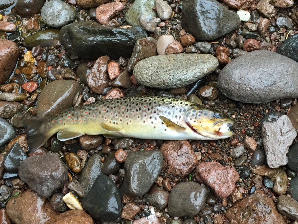 overgrown with willows, bushes, and snags. There is some evidence of damage to the riverbanks by cattle, but I don’t see a boot mark anywhere, a good sign. My very first cast catches a willow behind me, eliciting a loud GRRR. The second cast is more accurate, and a 13-inch brownie clobbers the Royal Trude. Not a bad start…and the action