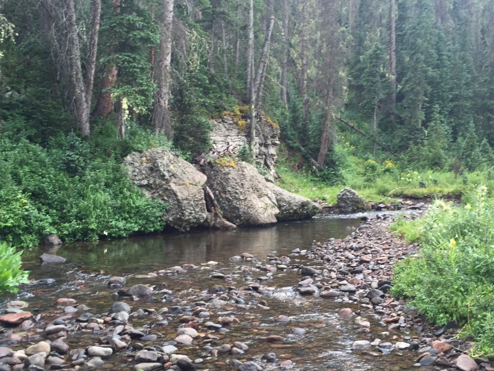 it’s still a better route than trying to bushwhack through the forest that is littered with deadfalls and covered by lush vegetation. I walk east on the abandoned road for a mile or so then cut down to the river through some open meadows that show up on my GPS. I jump a small herd of cattle that seem to look at me somewhat incredulously–“What are you doing here!!” At the edge of the meadow is a rock wall that drops precipitously fifty feet or so to the river. I gingerly test the scree slope and finally make it down, holding onto bushes to slow my descent. Wading boots don’t make the best mountaineering shoes!! But all’s well that ends well, as I catch sight of some of the beautiful pools downstream. I decide to hike down another 15 minutes, to just above where the forest opens into the big meadows. I could have reached the same point by hiking up from the Trujillo Meadows Reservoir parking lot–probably about the same distance and a bit easier going, but then I wouldn’t have all that fun bushwhacking! No gain without pain?
